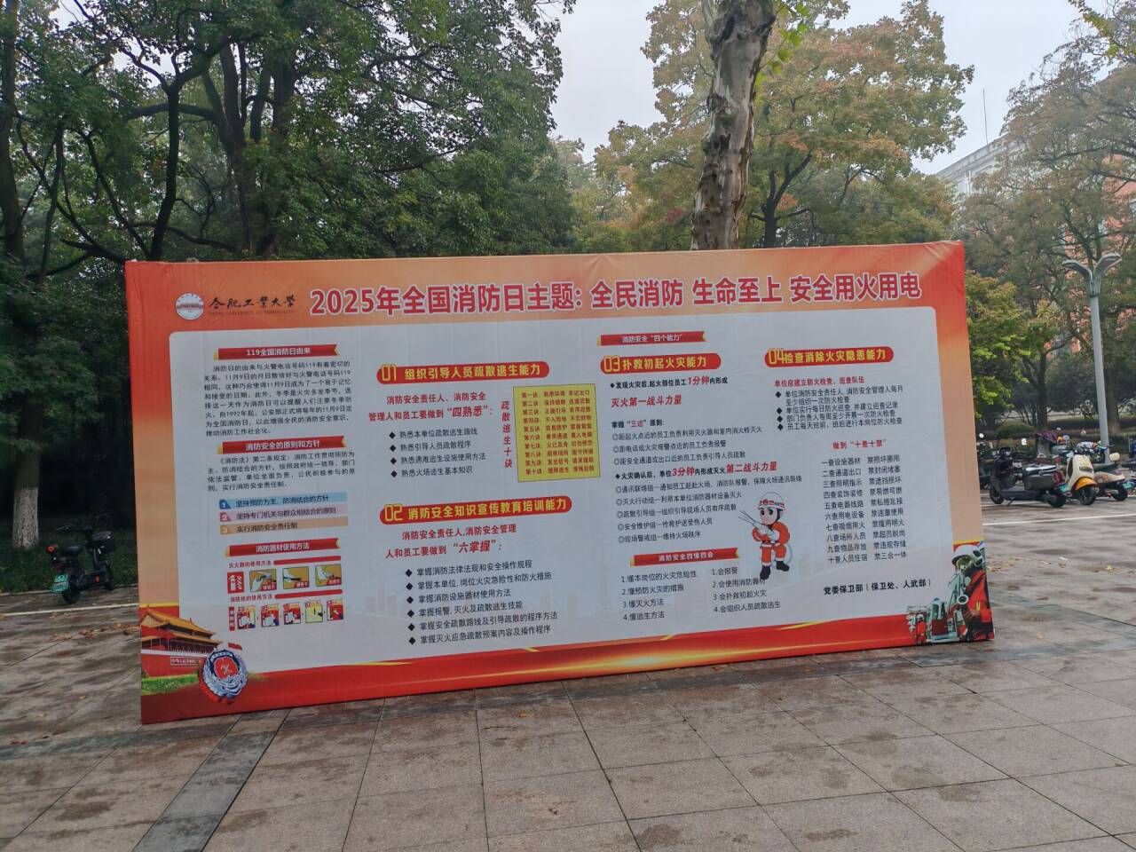 学校在屯溪路校区、翡翠湖校区等重点区域设置主题宣传桁架和展板,并通过校园电子屏、工大卫士微信小程序等多平台推送消防安全知识和警示案例,实现宣传全覆盖。11月9日,保卫部、学工部、总务部等部门在合肥校区联合开展线下宣传活动,形成部门联动、全员参与的良好局面,11月12日、24日,分别在屯溪路校区学生公寓、科技楼组织开展“一楼一案”消防应急疏散演练;11月20日,组织师生集中观看火灾警示教育片,切实提升师生应急避险能力,11月28日,特邀合肥市消防救援支队专家来校开展消防安全专题讲座;宣传月期间,先后为国际教育学院、仪器学院、电气学院、校直机关、饮食服务中心、幼儿园等单位举办消防安全知识讲培训与灭火实操演练。