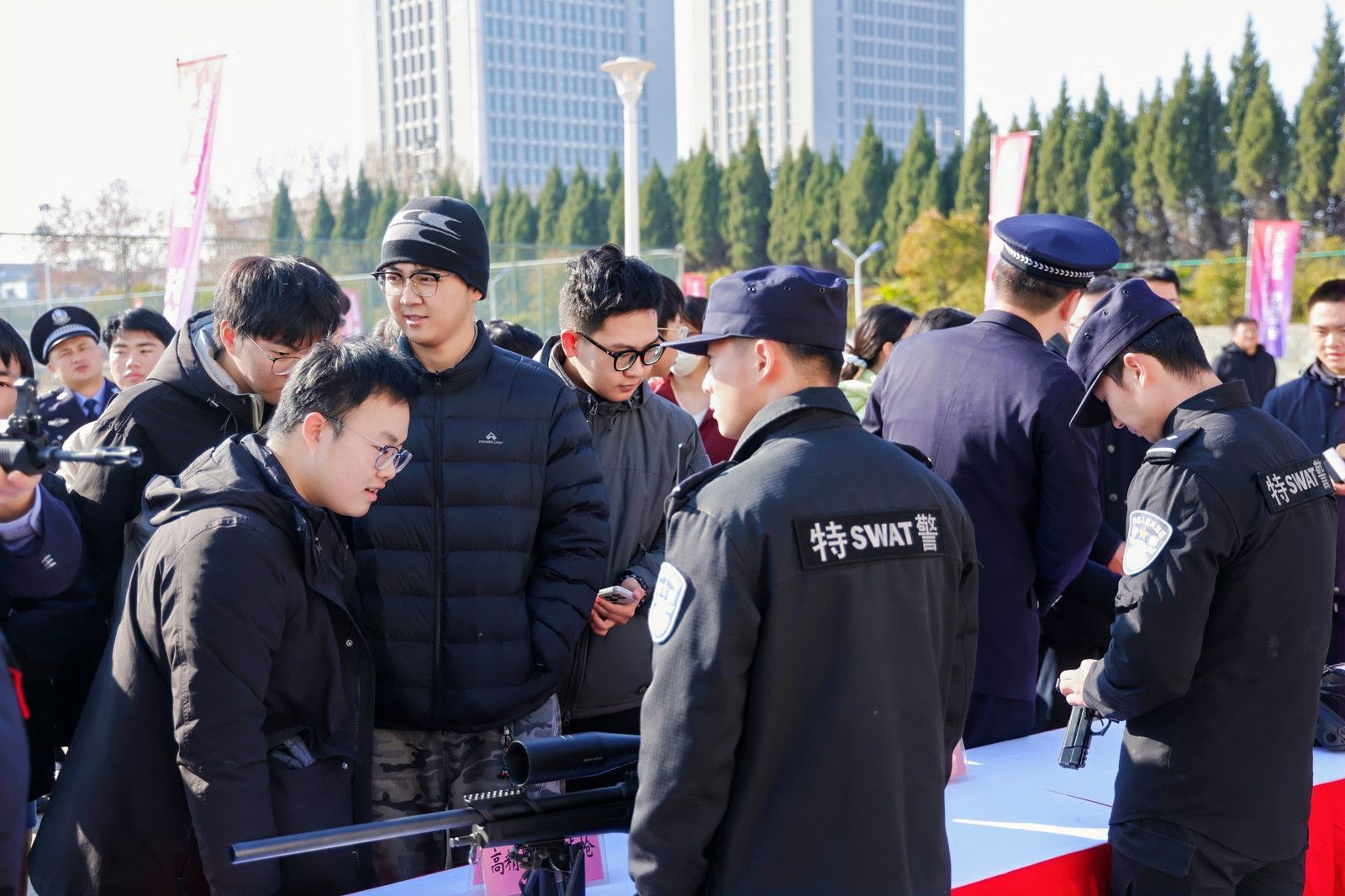 活动现场设置了法律咨询区、互动体验区、特种装备展示区,还邀请了医疗卫生、消防救援、公安特警等部门同步宣传急救、防火、防暴等知识内容,吸引众多师生驻足交流。