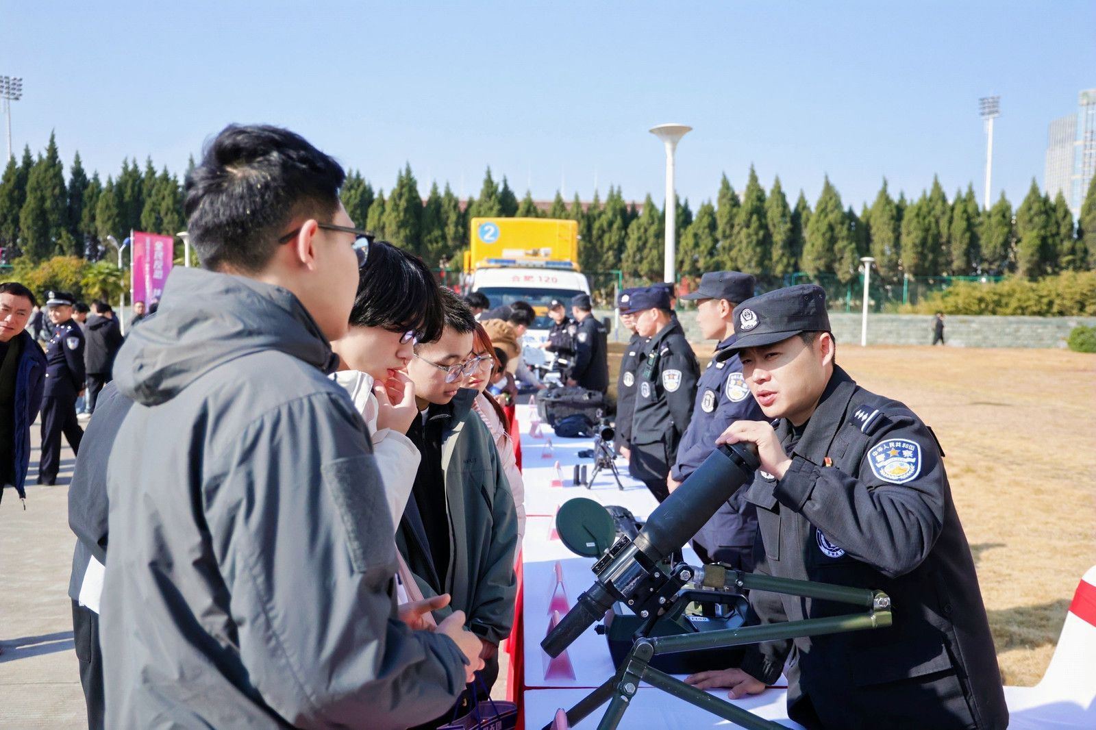 装备展示区内,反恐防暴车、排爆机器人及各类警械整齐陈列,民警细致讲解其功能与用途,不少师生驻足观看、拍照记录。通过本次活动,让我校师生零距离体验反恐装备,同时进一步增强师生“知恐、识恐、防恐、反恐”的意识和能力。